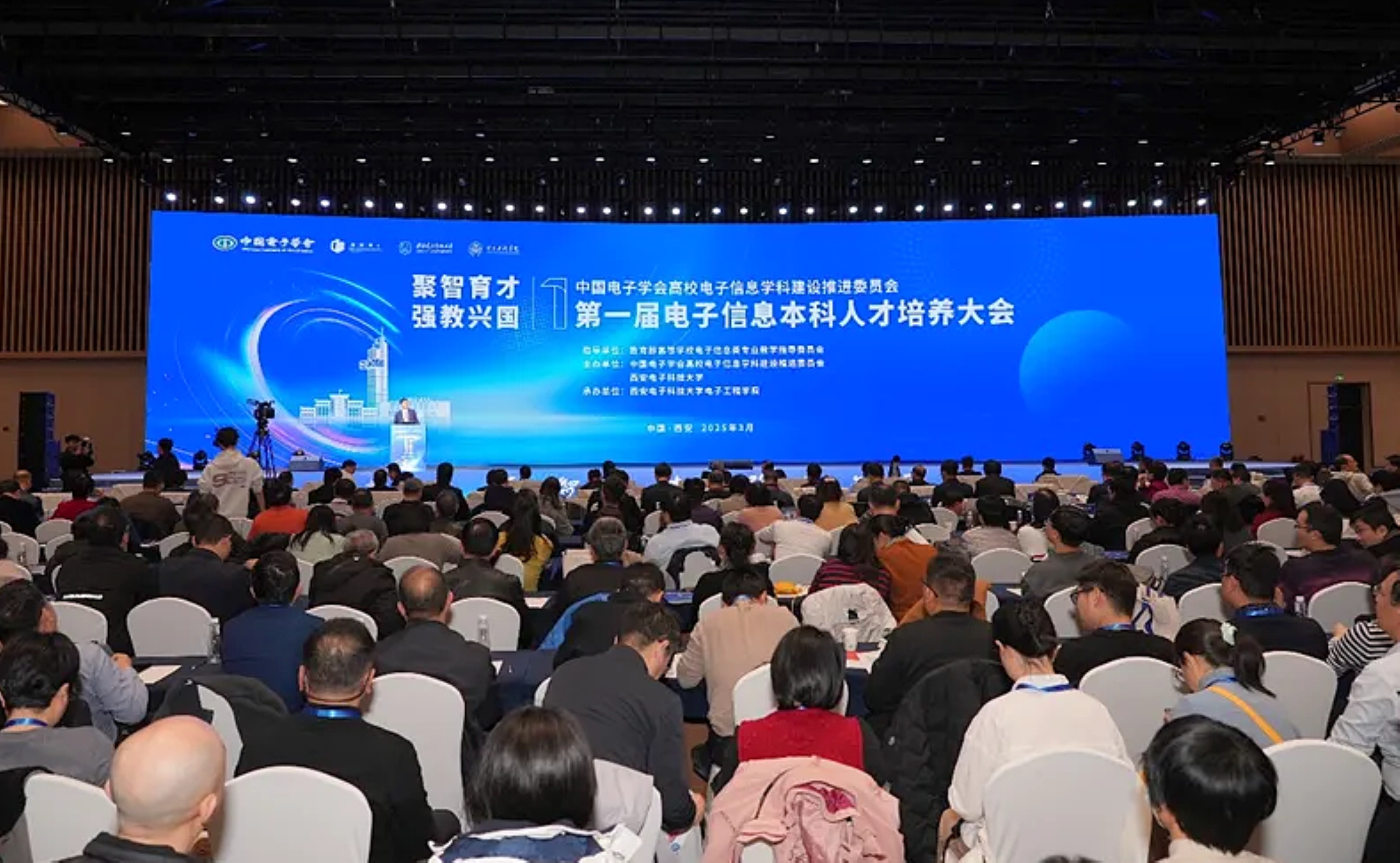 第一届电子信息本科人才培养大会由教育部高等学校电子信息类专业教学指导委员会指导,中国电子学会高校电子信息学科建设推进委员会与西安电子科技大学联合主办,西安电子科技大学电子工程学院承办,两院院士、全国电子信息领域百余所高校相关学院(系)负责人、专家学者、骨干教师及重点企业代表等1000余人参会。大会以“聚智育才 强教兴国”为主题,聚焦电子信息领域人才培养的热点问题,共商新时代电子信息人才培养,推动教育理念与教学模式创新与发展。中国科学院院士、电子信息类教指委主任委员、西安电子科技大学教授郝跃,中国工程院院士、北京航空航天大学教授苏东林,中国工程院院士、北京邮电大学教授张平,中国电子信息产业集团有限公司党组成员、副总经理、西安电子科技大学校长张新亮分别作大会报告。