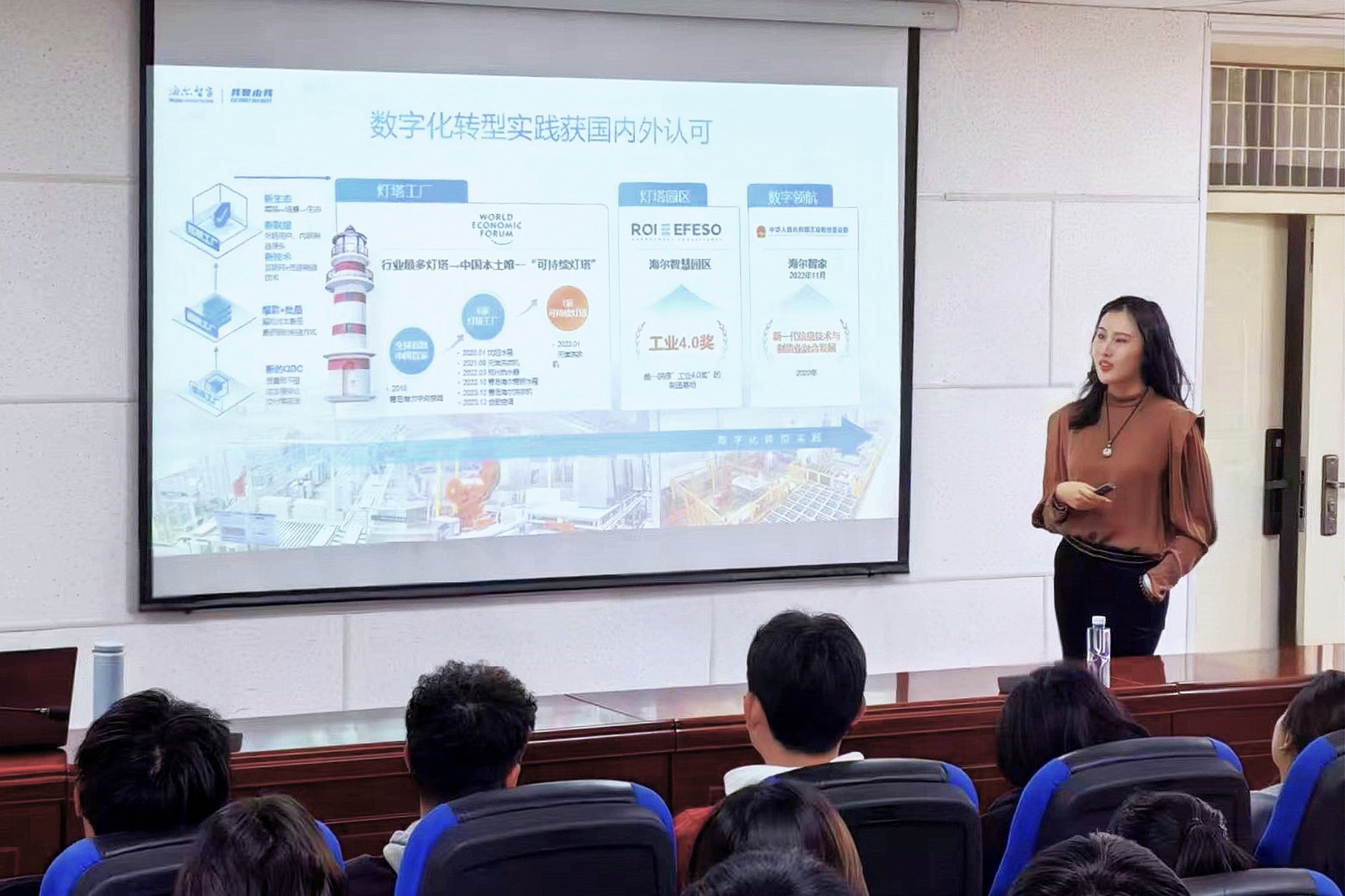 海尔智家人力资源招聘经理矫雅囡以海尔智家39年发展历程为主线,讲述了海尔从“砸冰箱”事件确立质量意识,通过质量革新奠定行业地位,并购GE Appliances首创“人单合一”的管理模式,构建全球研发、制造、营销三位一体布局,稳居全球家电龙头地位,连续7年入选《财富》全球最受赞赏企业的跨越式发展,详细解读了2026顶尖人才项目四大核心计划,介绍了“智青春·造未来”OPEN MONTH 创客暑期训练营。她讲到,作为家电行业的领军企业,海尔将凭借其卓越的技术创新能力和智能制造体系,为有意加入海尔的学子搭建从课堂到职场的桥梁,开放提前批简历投递通道,通过企业实践、课题攻关和职业发展赋能,帮助在校大学生提前积累行业经验并锁定优质岗位,优秀者可直通校招终面。