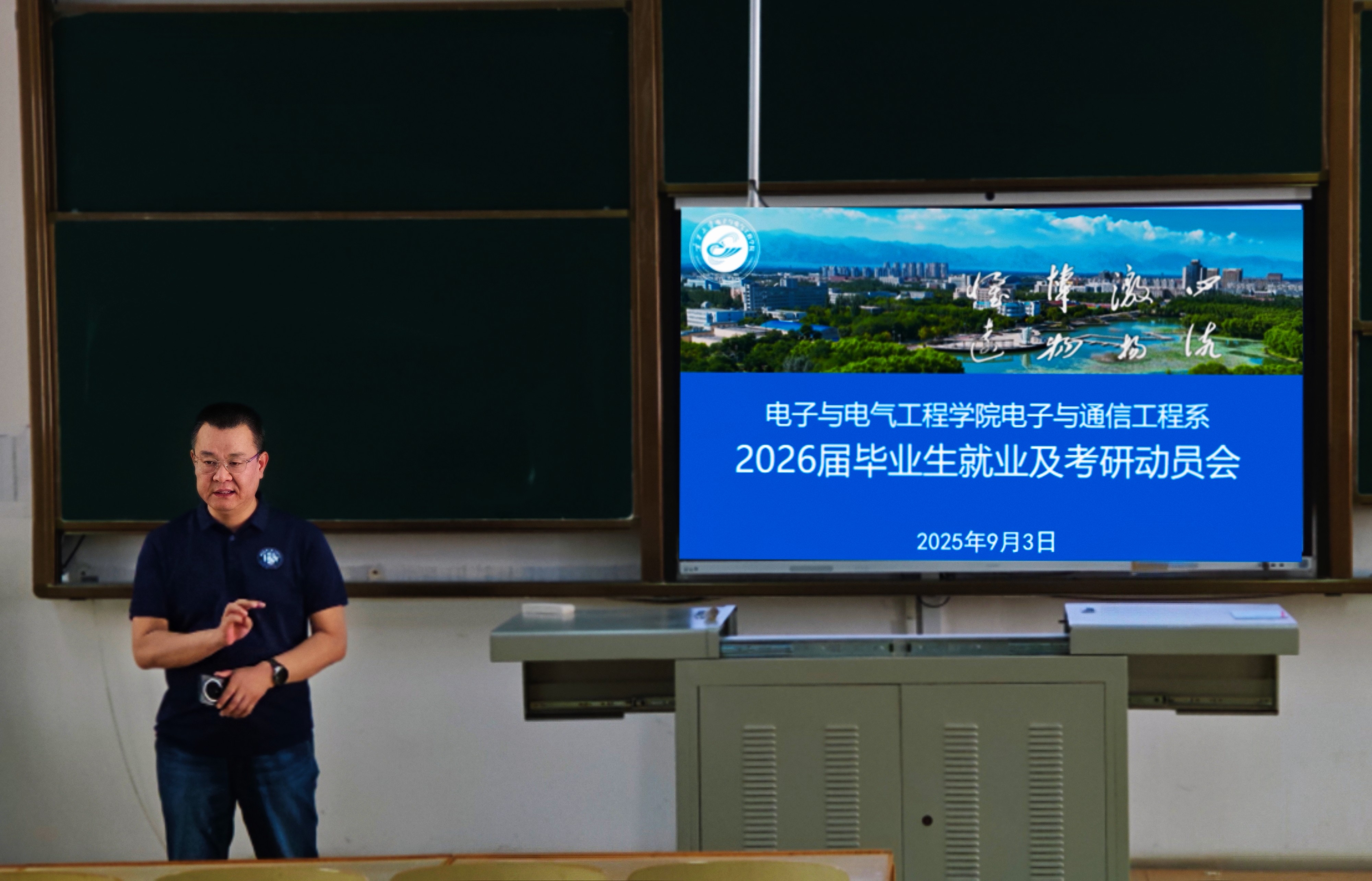 电子与通信工程系于怀远一教召开2026届毕业生就业与考研指导会。学院院长孙学宏、骨干教师杨向红及2026届全体毕业生参加会议,会议由系副主任覃国车主持。